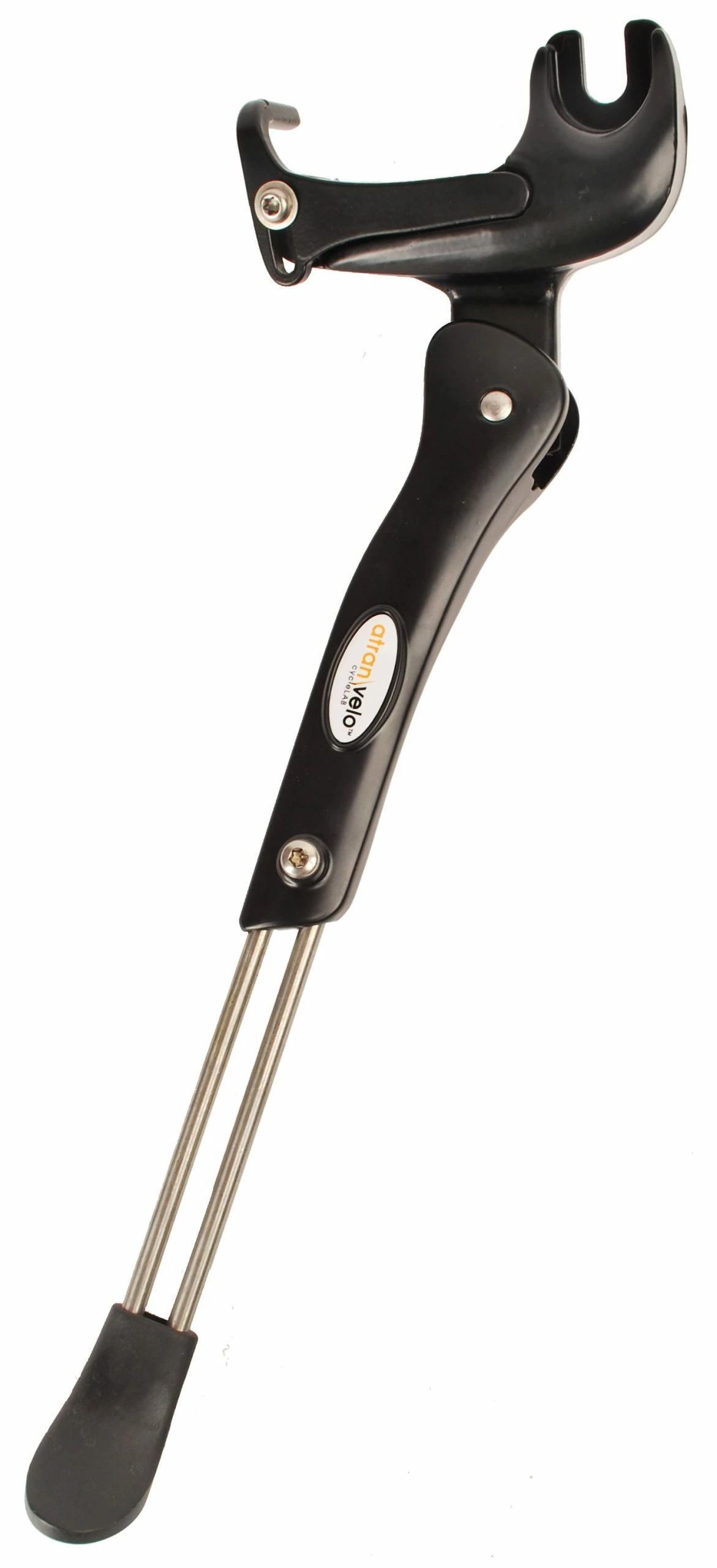 Sidder under hjulmøttrik eller QR og armen omkring stellet.