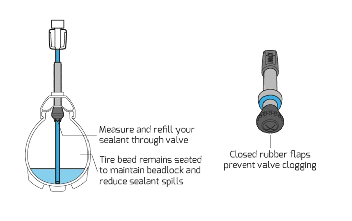 Ventilerne bliver ej heller tilstoppede af væsken da de er lavet med en selvlukkende gummiflap på indersiden som holder tubeless væsken ude af ventilen.