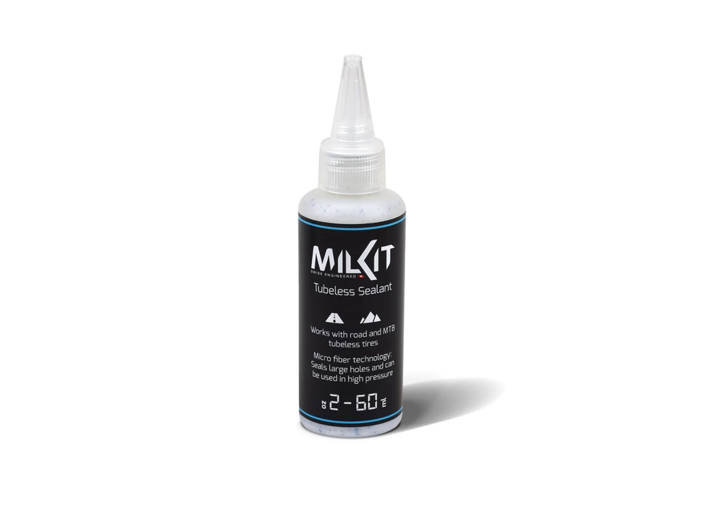 Milkit sealant er lavet på syntetisk latex opblandet med små fibrer og virker med både mountainbikedæk og racerdæk.