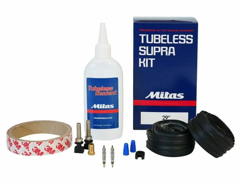 Tubeless kit fra Mitas med alt hvad du skal bruge for at opsætte et hjulsæt på en 29″ cykel til tubeless.