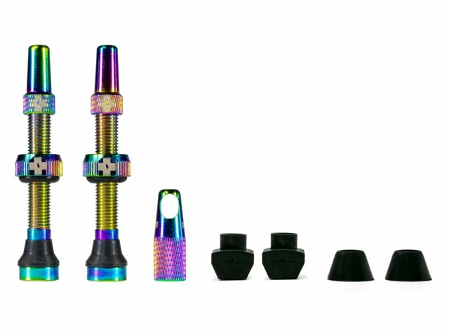 Muc Off tubeless ventiler i den fineste regnbue / Oil slick farve, som kan bruges til både MTB og racer.