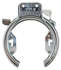 Sølvfarvet ringlås med to nøgler og monteringshuller så den både kan monteres i hullerne i siden af bøjlerne eller i toppen af låsen.